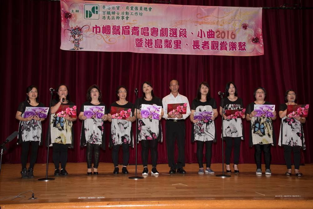 巾幗鬚眉齊唱粵剧選段、小曲2016暨港島鄰里、長者觀賞樂聚日期:2016 年 11 月 19 日(2016年11月19日)由本會、百職婦女活動工作坊、港島區幹事會主辦的,巾幗鬚眉齊唱粵劇選段、小曲2016暨港島鄰里、長者觀賞樂聚假座香港禮頓山社區會堂舉行。一曲《巾幗鬚眉傳承中國戲曲》大合唱展開了序幕。大家的表演贏得了一次又一次的掌聲,特別嘉賓曾國光導師為大家獻唱名曲,氣氛熱閙。曾國光導師領唱的一首《再會歌》為是次活動劃上完滿句號。(圖片由DC趣影組提供) 返首頁 關 閉 打 印